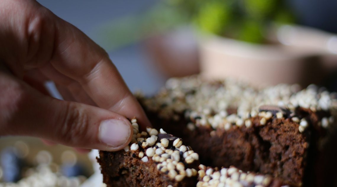 Neem een vierkante bakvorm bekleed met bakpapier. Doe er het chocolademengsel in, overstrooi met quinoapops, stukjes zwarte chocolade en zwart sesamzaad.