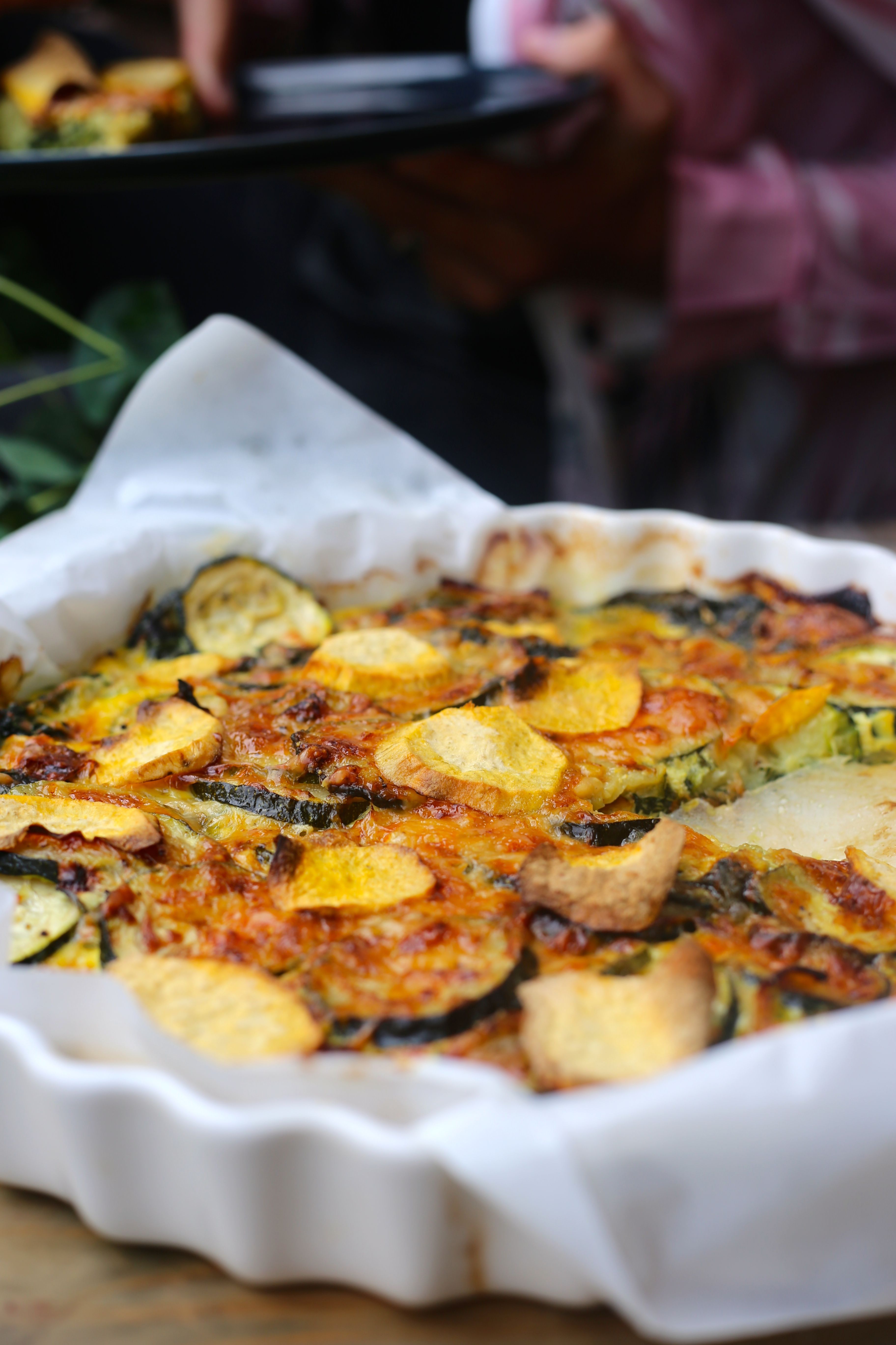 - Verwarm je oven voor op 160 °C.Neem een pan met olijfolie en stoof er de ui en de lente-ui in.Bak de courgetteschijfjes aan met de ui. Voeg de spinazie toe enkruid met peper en zout.Klop de eieren los en voeg er de ricotta bij. Snijd de verse kruidenfijn en voeg ze bij het eiermengsel. Meng of klop alles goed doorelkaar.Schil de zoete aardappel en snijd hem in dunne schijfjes.Neem een ovenschaal, leg er een vel bakpapier in of wrijf de schaalin met kokosolie.Leg er een laagje courgettes in, dan een laagje van het eimengsel,nog een laagje courgettes en eindig met het eimengsel. Zorg datje volledige ovenschaal bedekt is met het eimengsel.Schik nu de schijfjes zoete aardappel over je taart tot je taart he-lemaal bedekt is. Strooi er de parmezaan over.Plaats in de oven op 160 °C gedurende ongeveer 60 minuten.Eet samen met een knapperige rucolasalade.