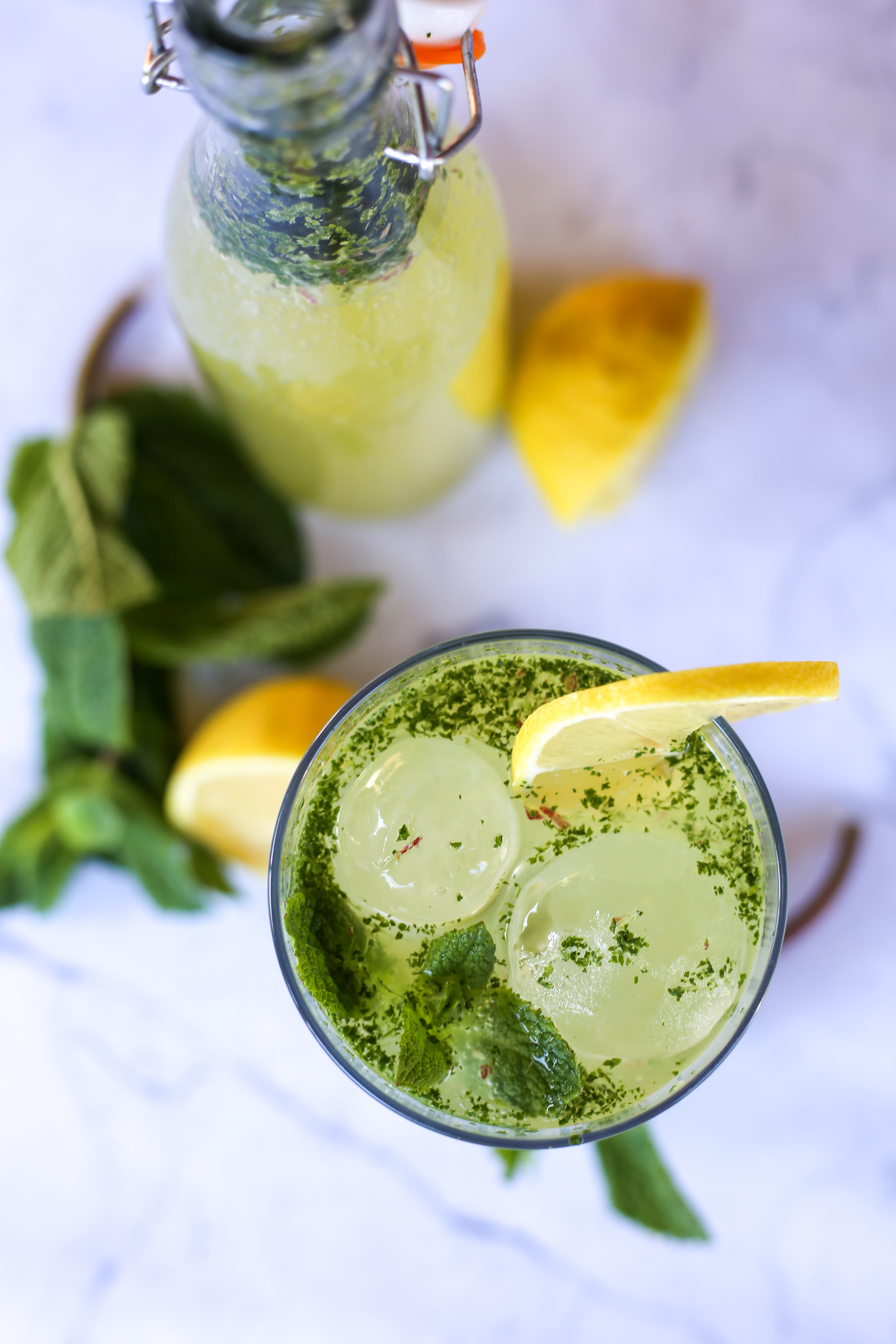 Mix tot takjes munt fijn zijn. Leng aan met water en ijsblokjes.