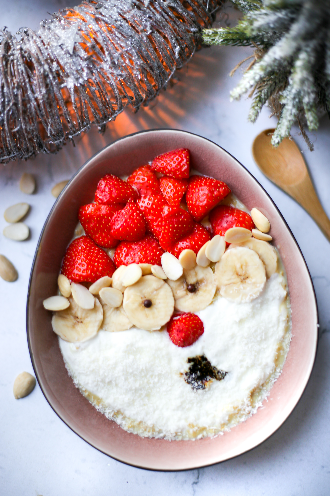 Giet deze in je kom, snijd de aardbeien middendoor en maak er de kerstmuts van. Maak met de yoghurt de baard.