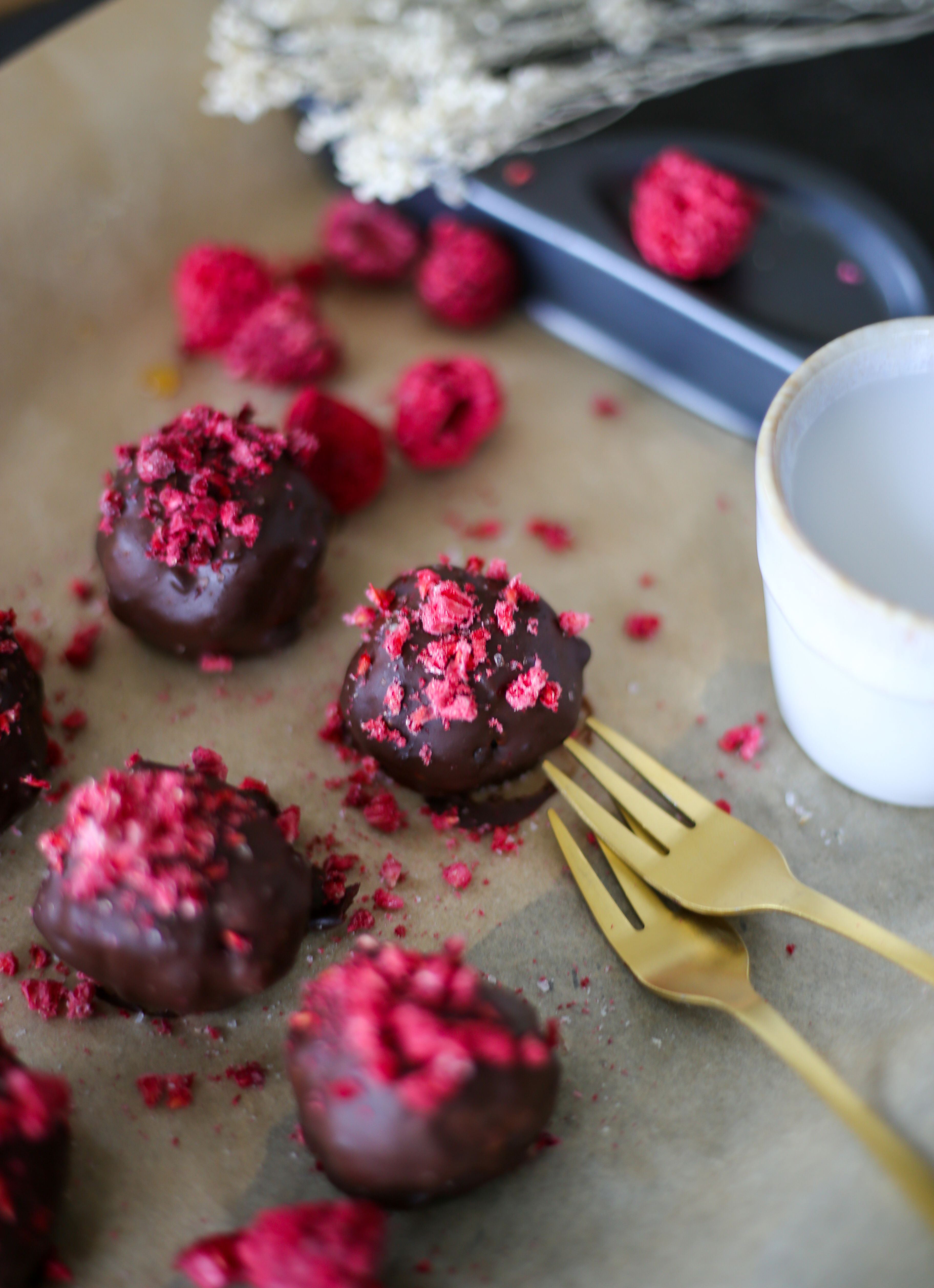 Smelt de chocolade au bain marie. Neem een vork en duw de balls onder de chocolade. Leg ze terug op het bakpapier. Doe alle balletjes zo en werk af met een crunch van de gevriesdroogde aardbeien of frambozen en grof zout.