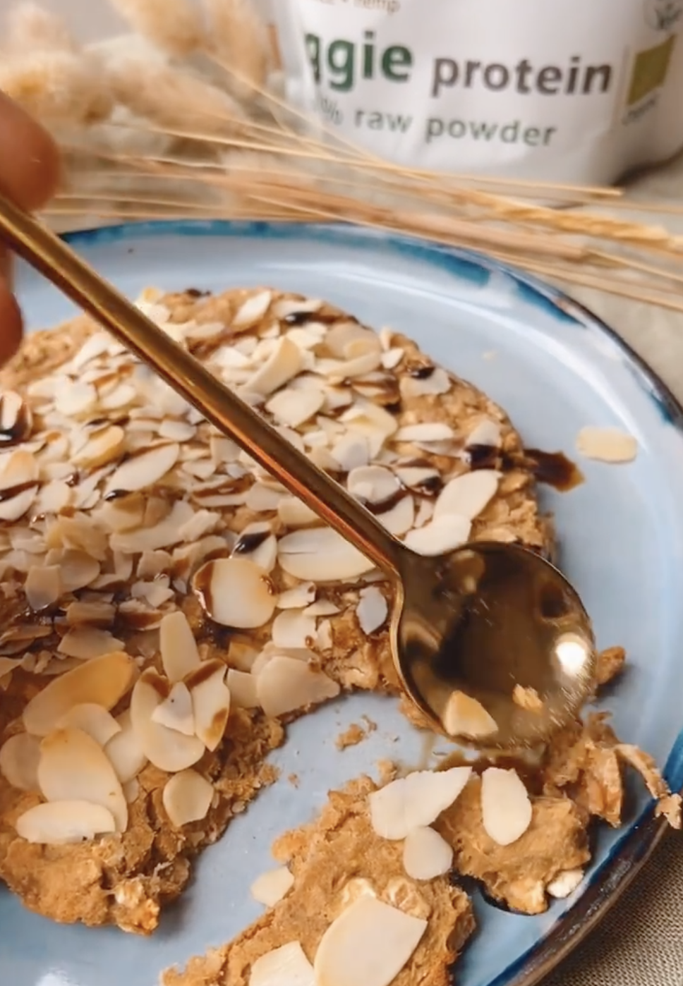 - Plet de banaan en doe er de havermout onder. Voeg er de notenpasta en proteinpoeder aan toe.Duw tot een platte koek. Druk er de amandelschilfers in.Bak op 180°C ongeveer 10-15 min of in je airfryer 7 min. Giet er een scheutje honing over en eet eventueel met wat yoghurt.