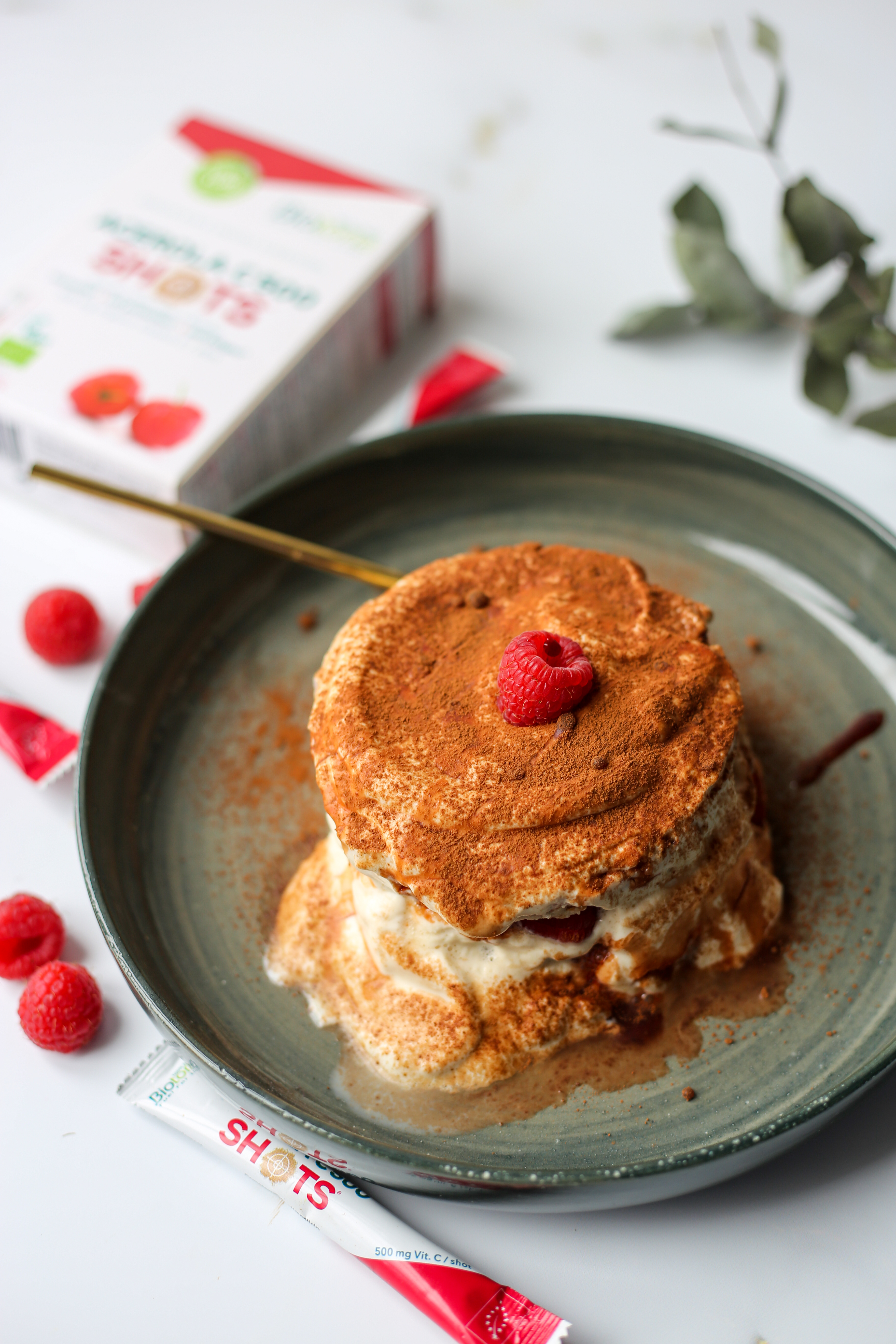 - Werk af met cacaopoeder en frambozen. Laat even 30 min in de koelkast staan en serveer.