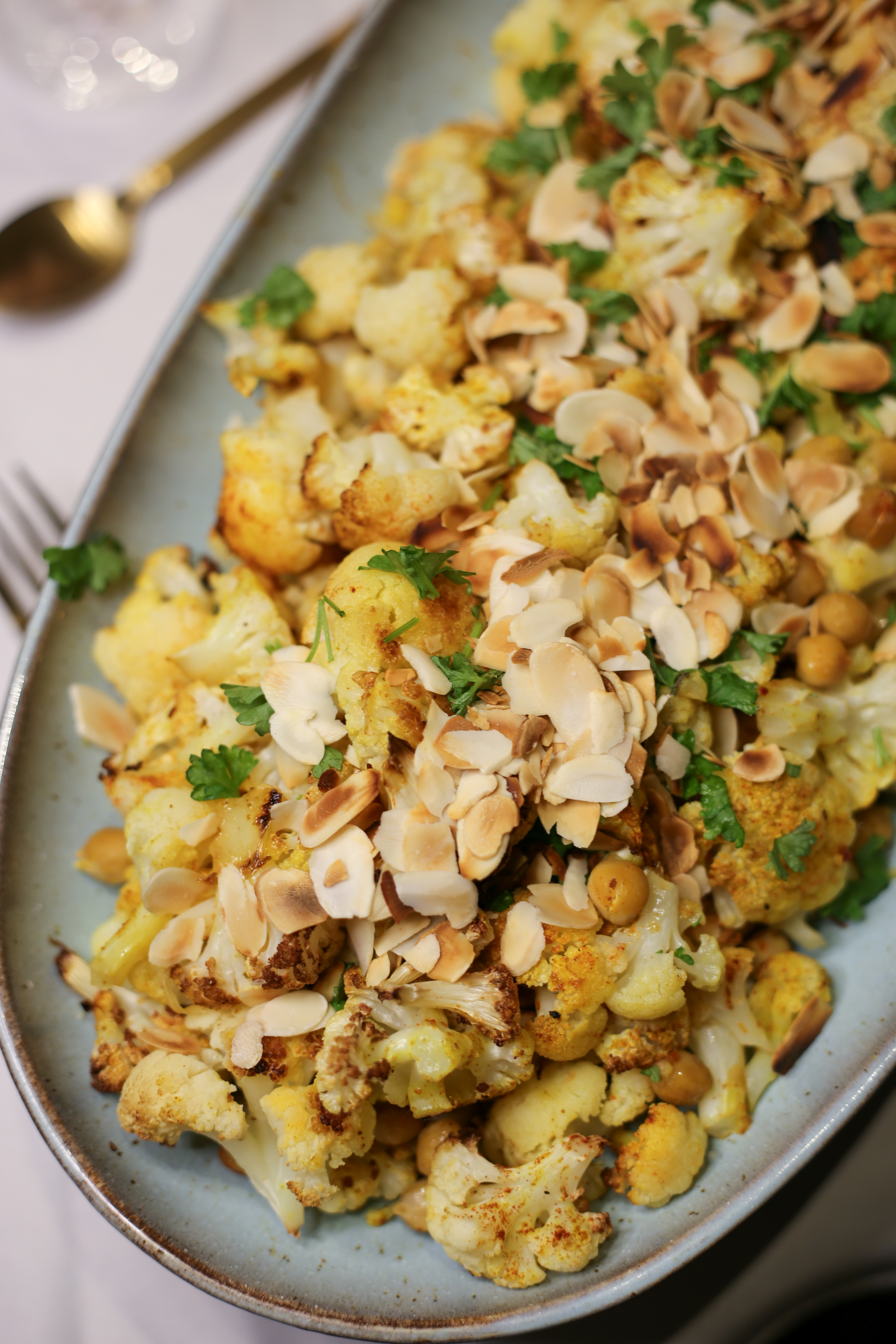 - Spoel ondertussen de kikkererwten, plaats deze ook op je bakplaat gedurende de laatste 10 min van je bloemkool.